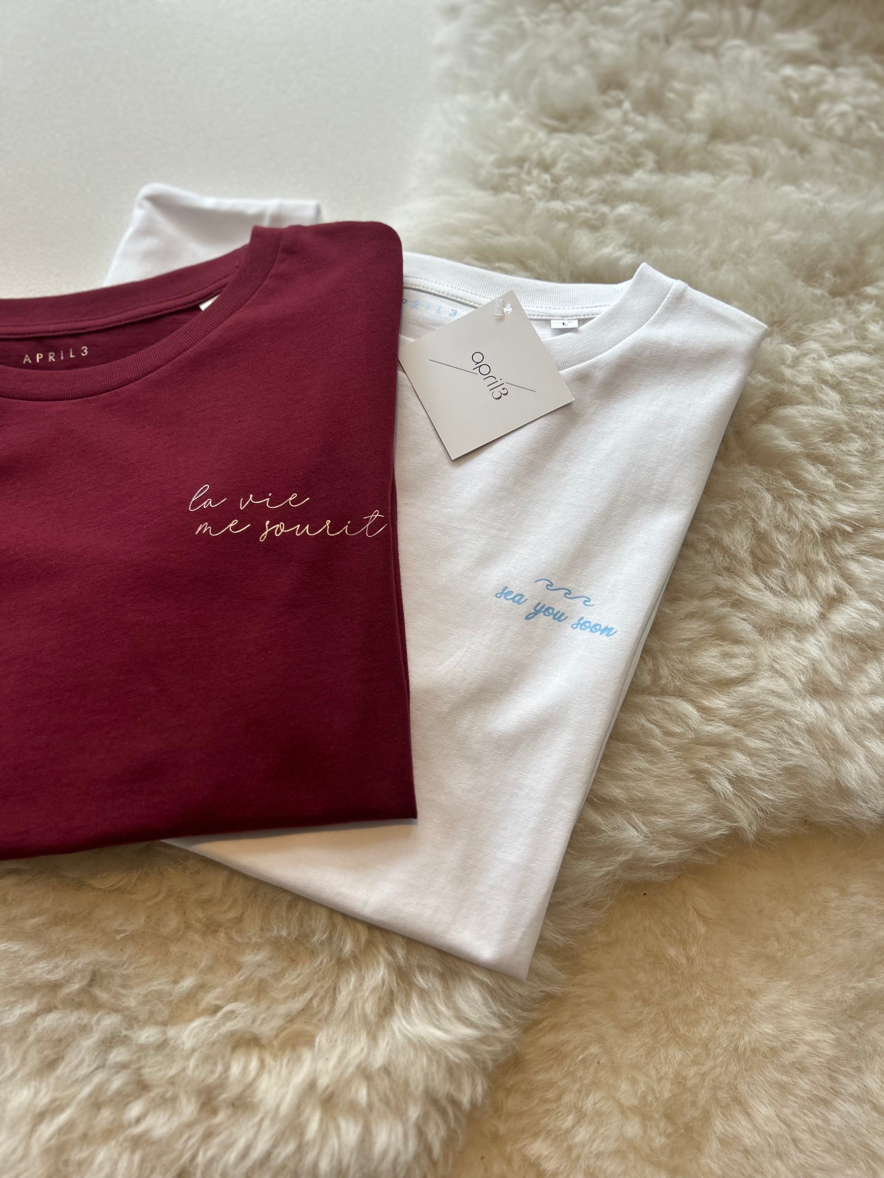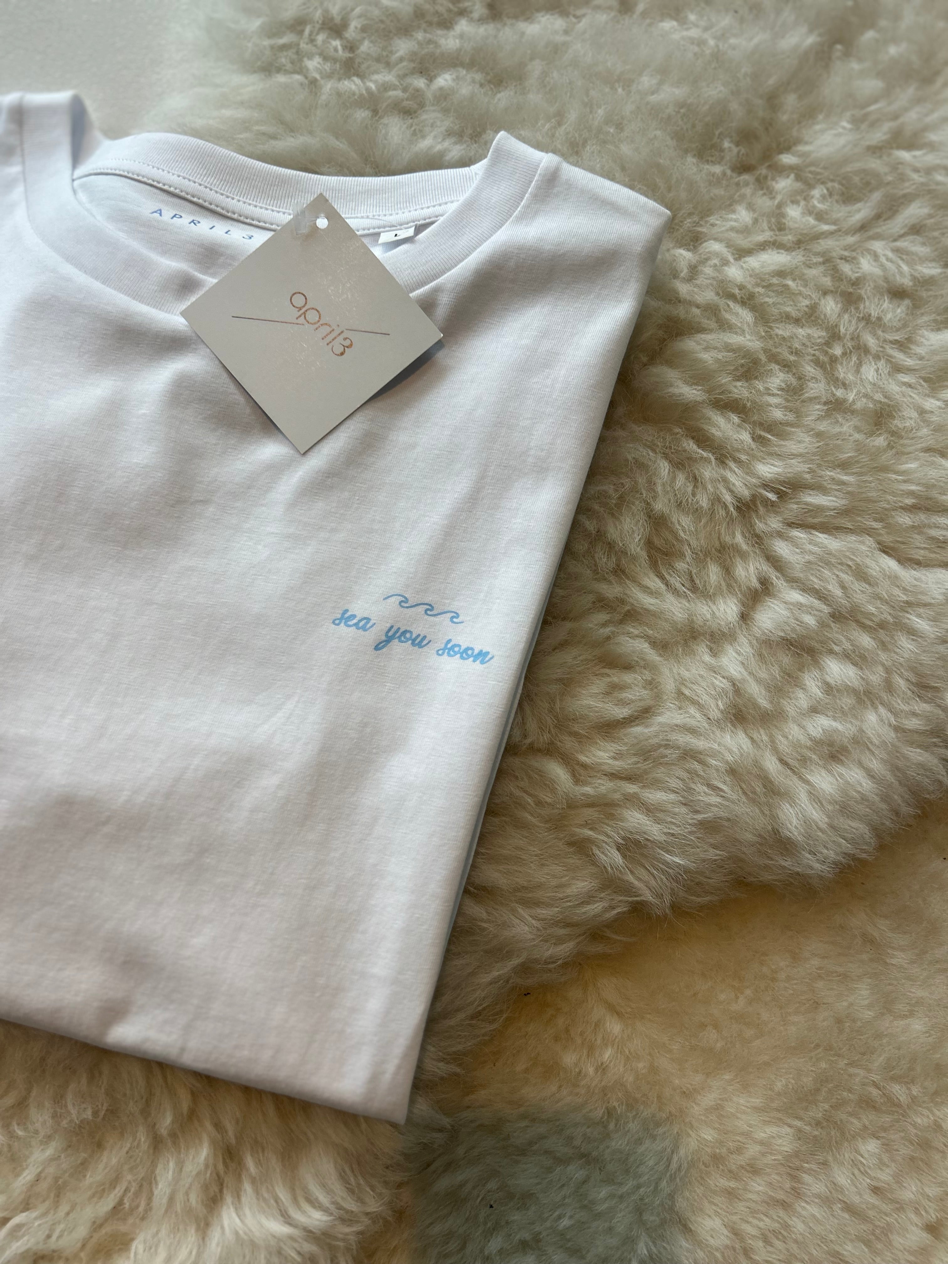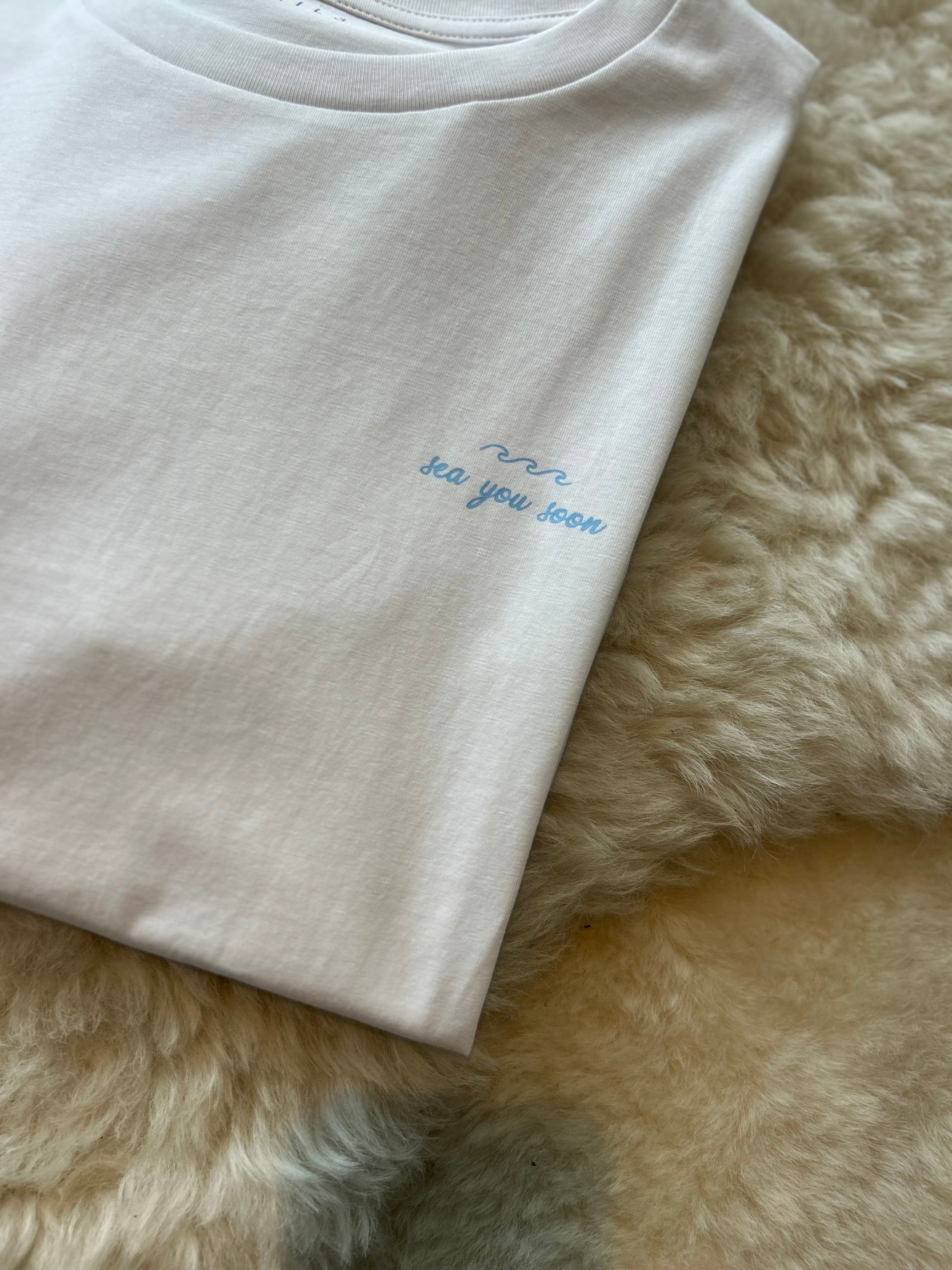 White | t-shirt | short sleeves | light blue print | ‘sea you soon’ | for babies, boys, girls, men & women.