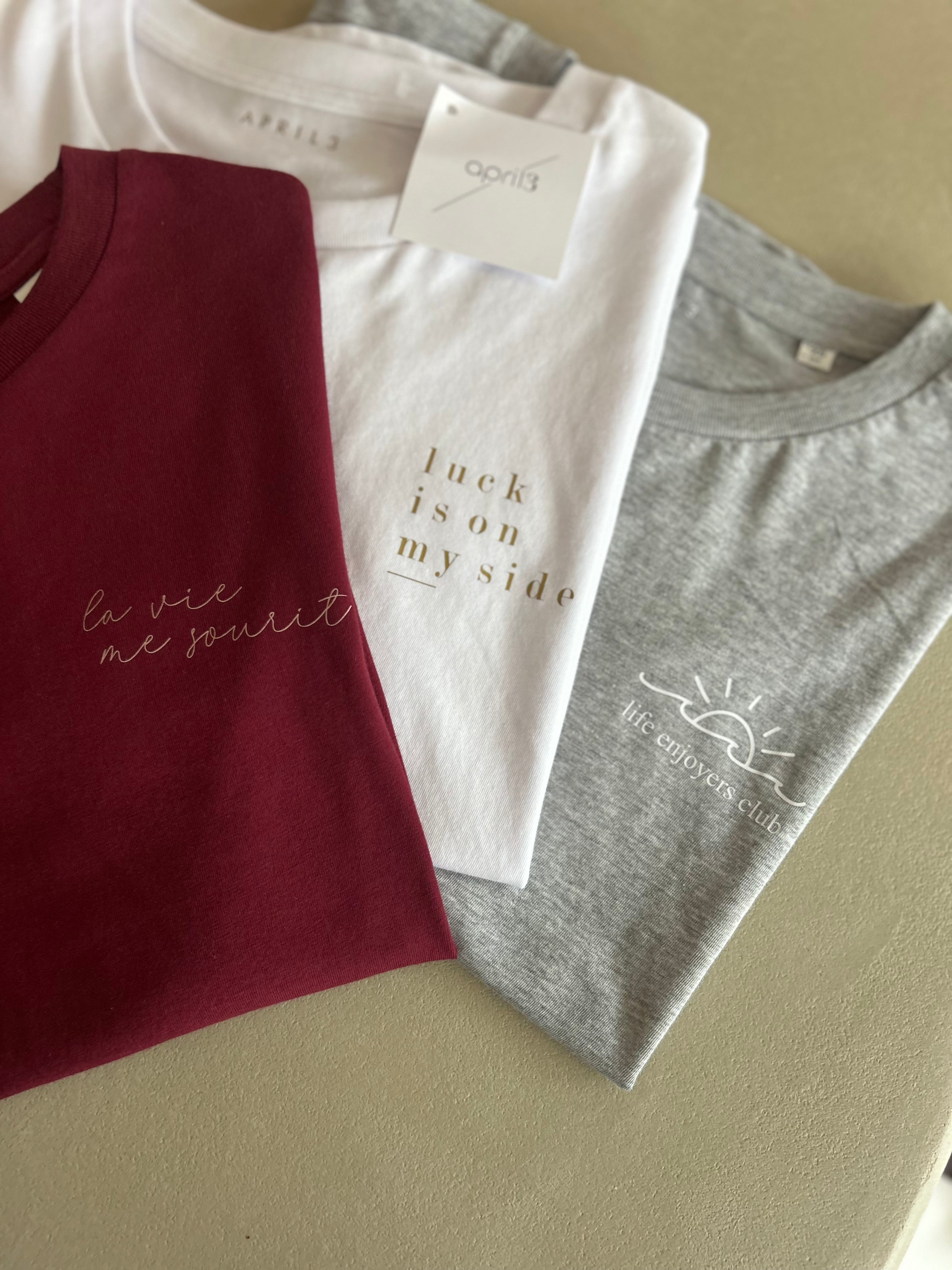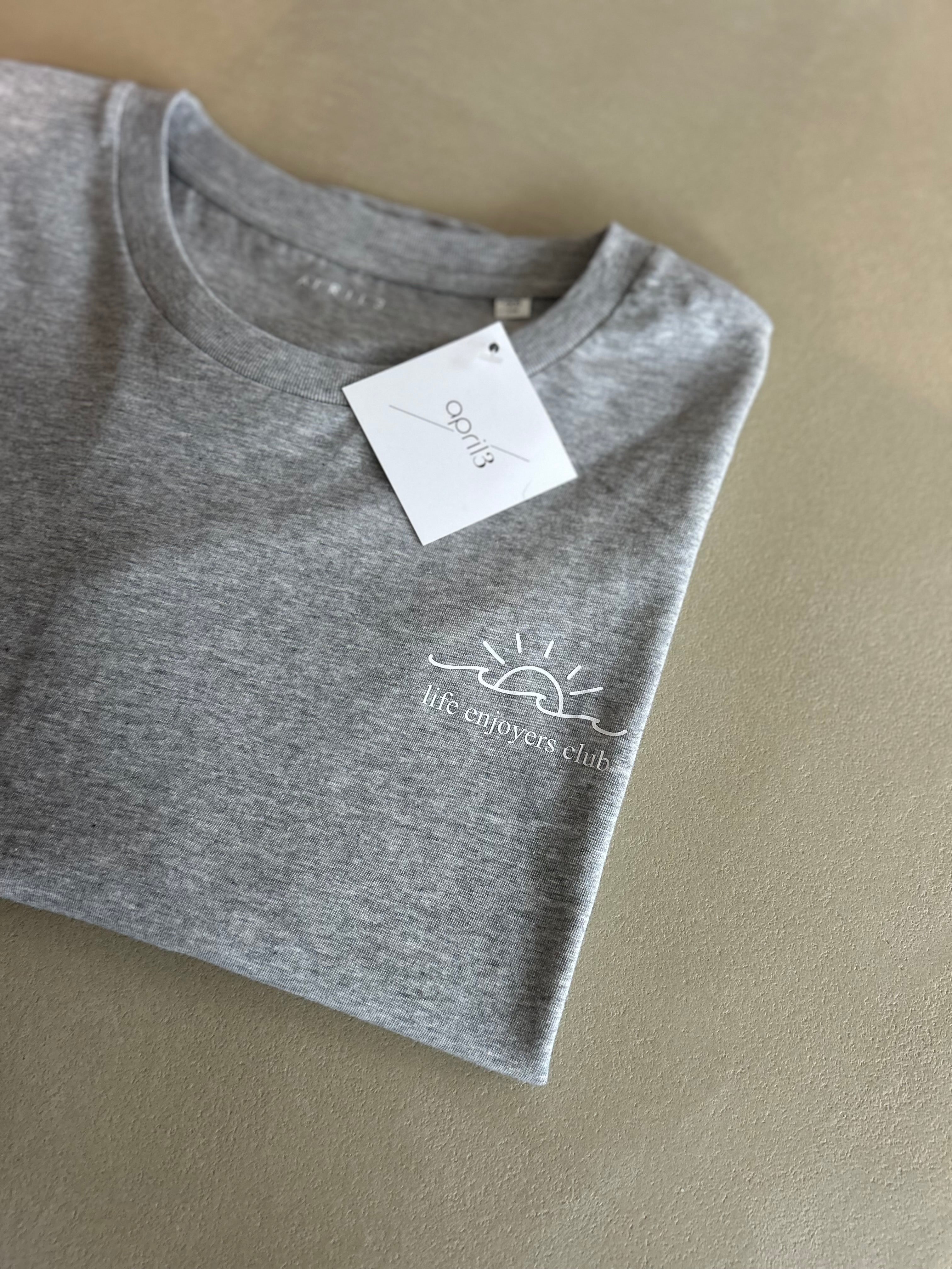Soft grey T-shirt | white print | ‘life enjoyers club’ | relaxed fit | with slightly longer sleeves | for women.