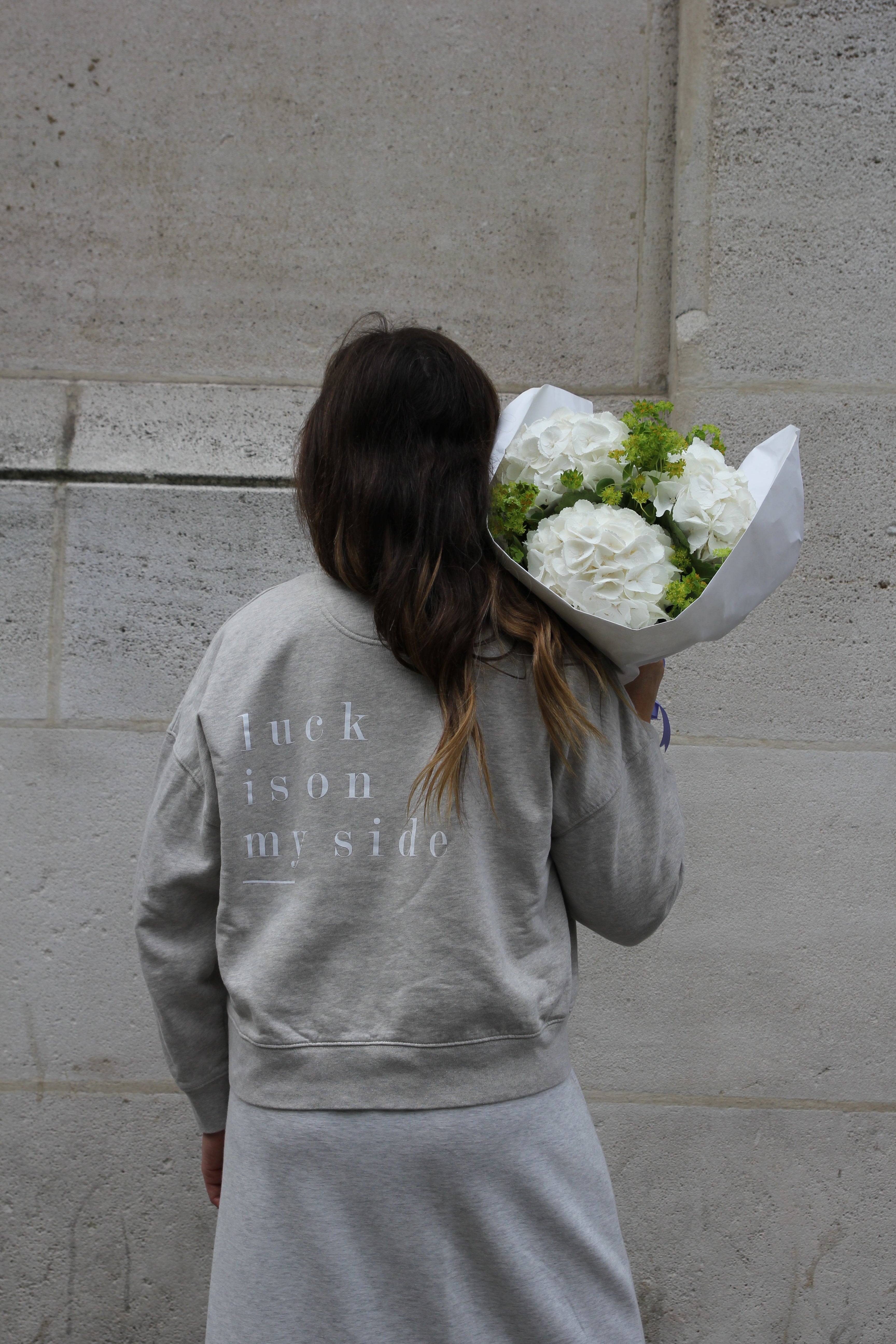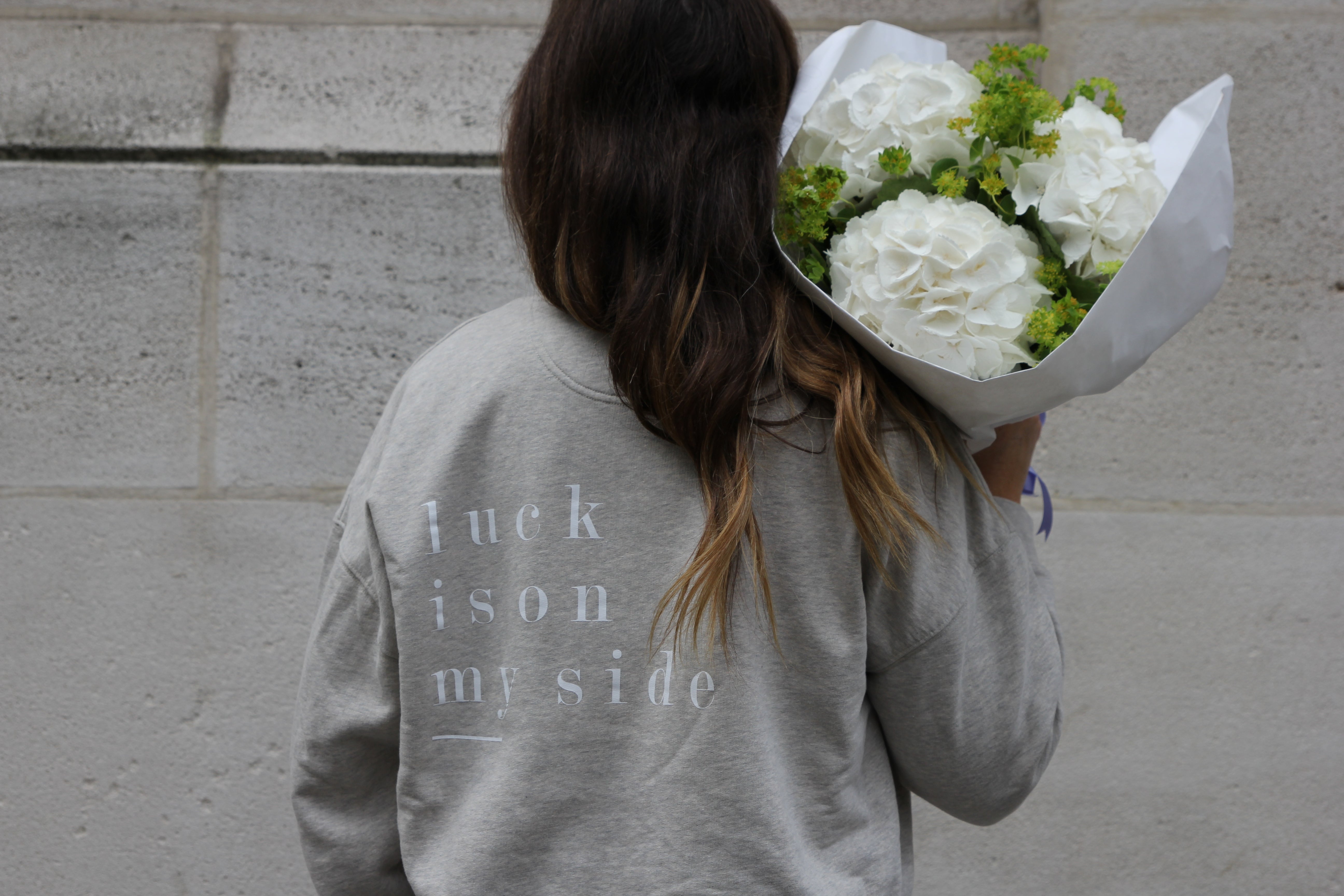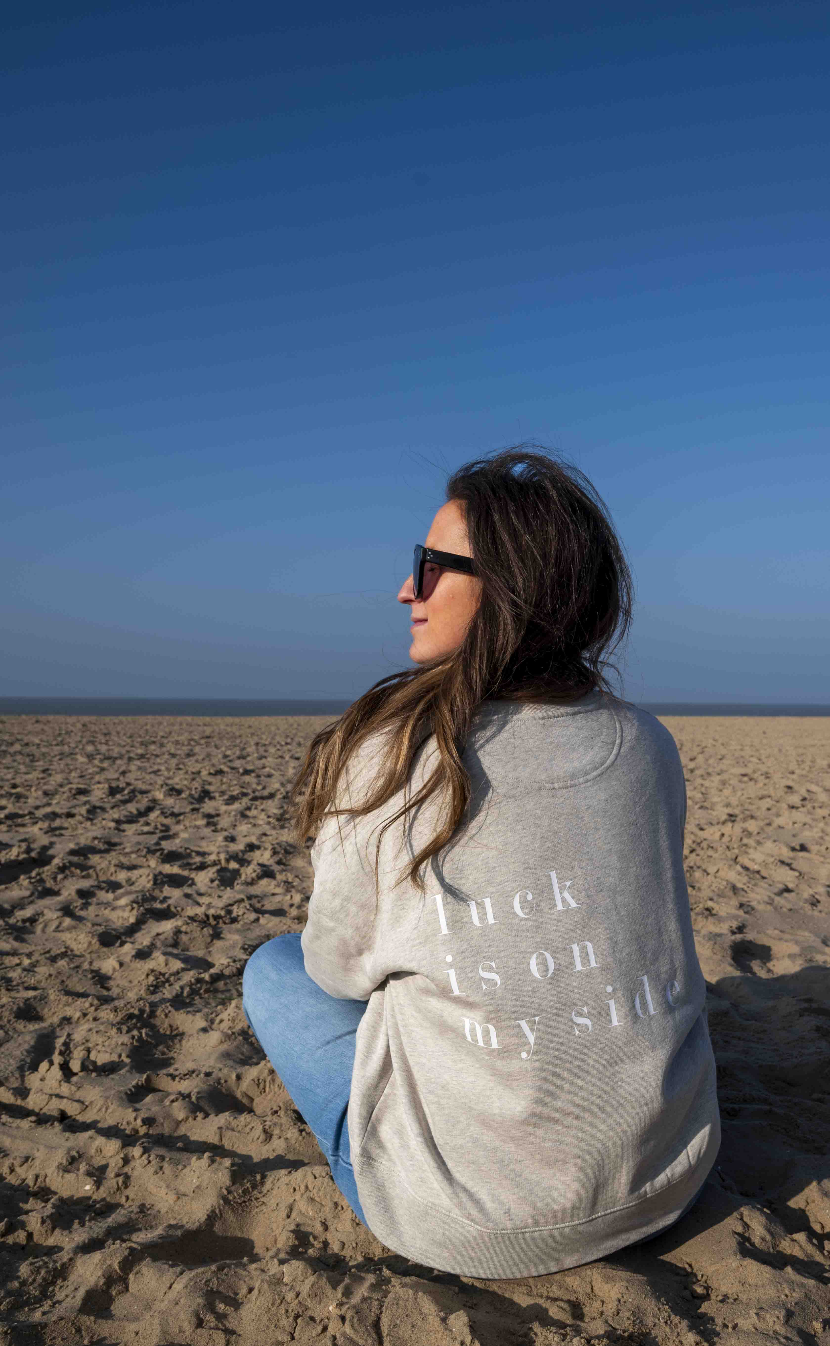 Beige/grey sweater | white print on the back, no print on the front | ‘Luck is on my side’ | relaxed fit | for women.
