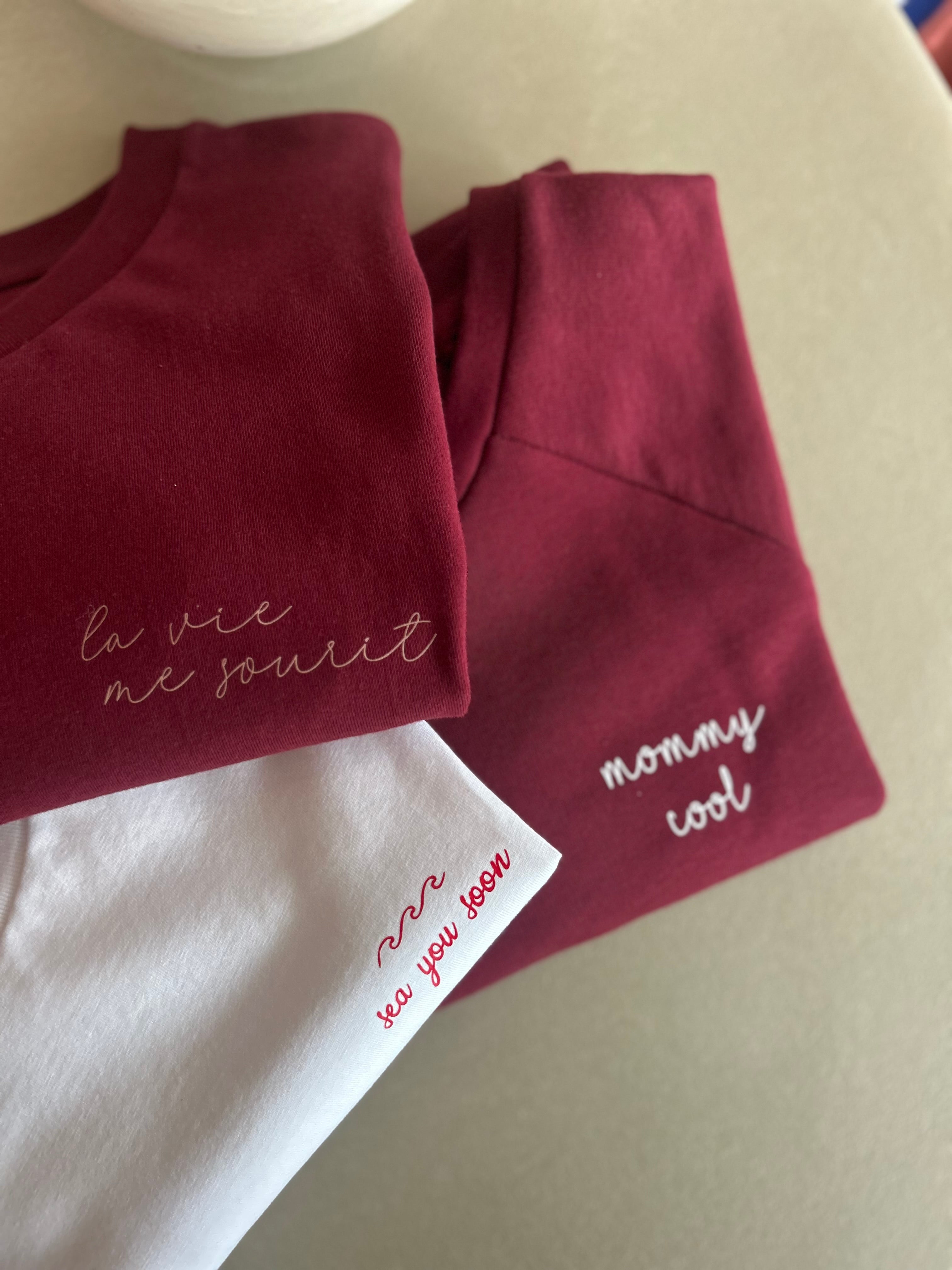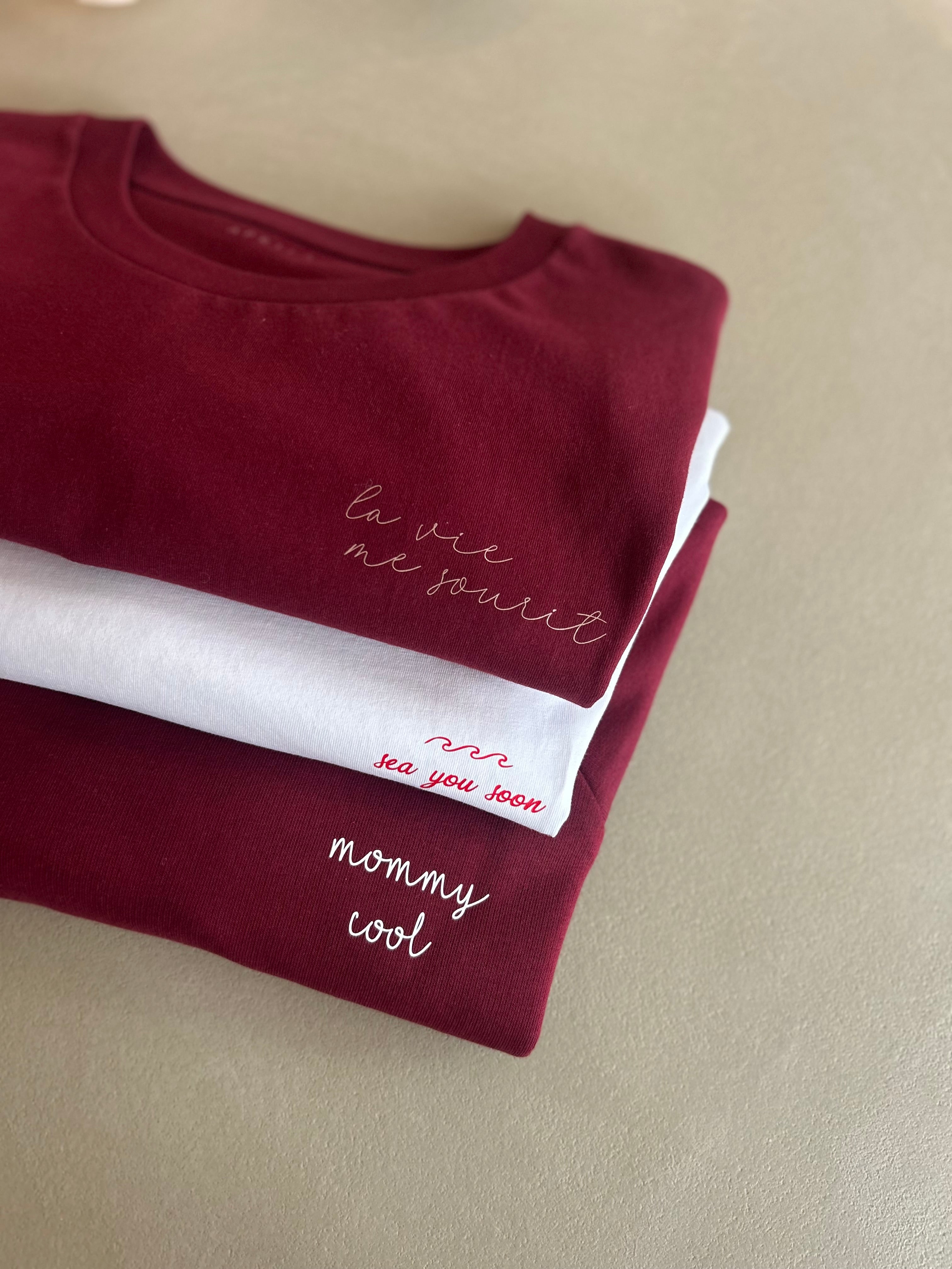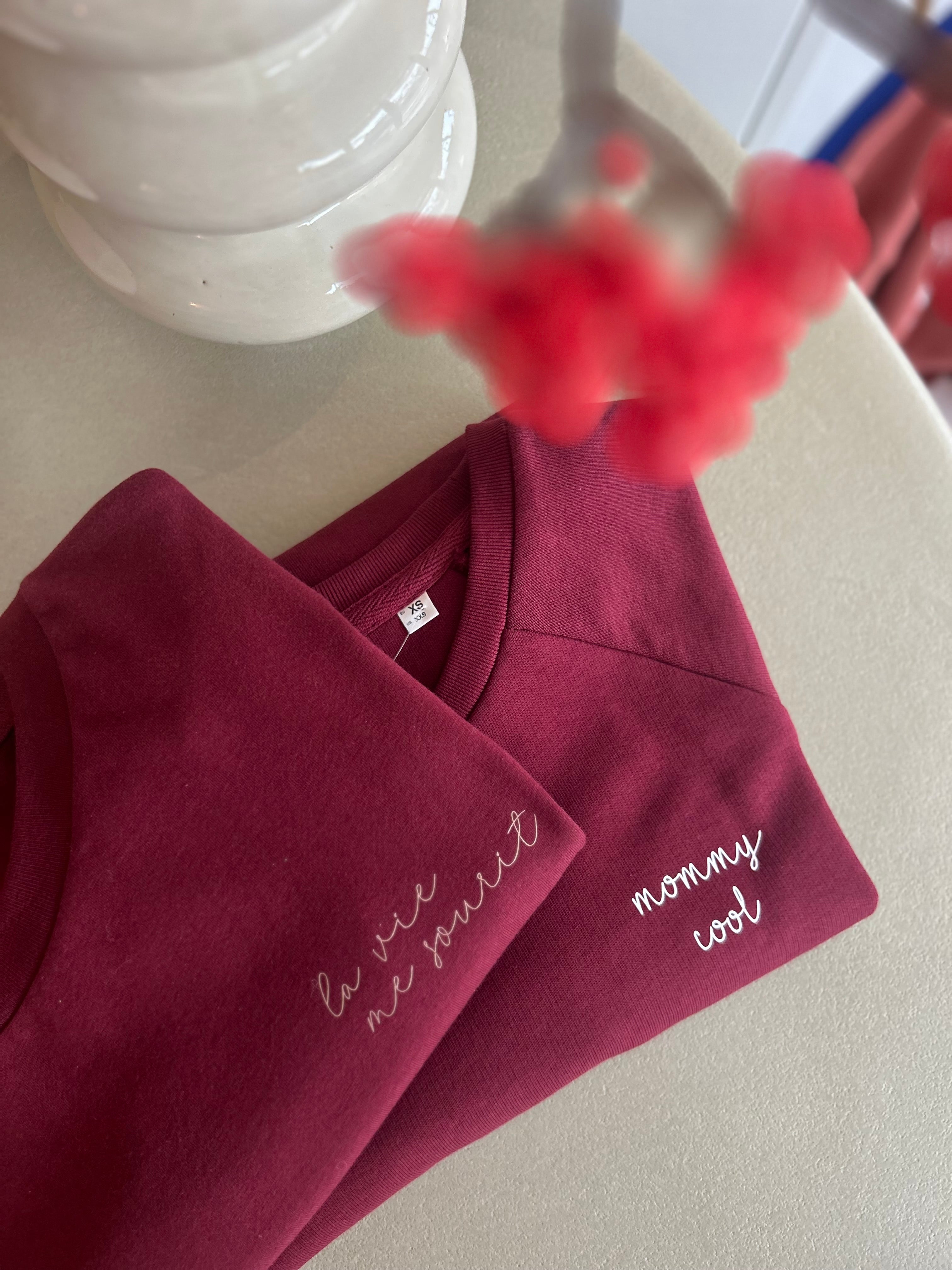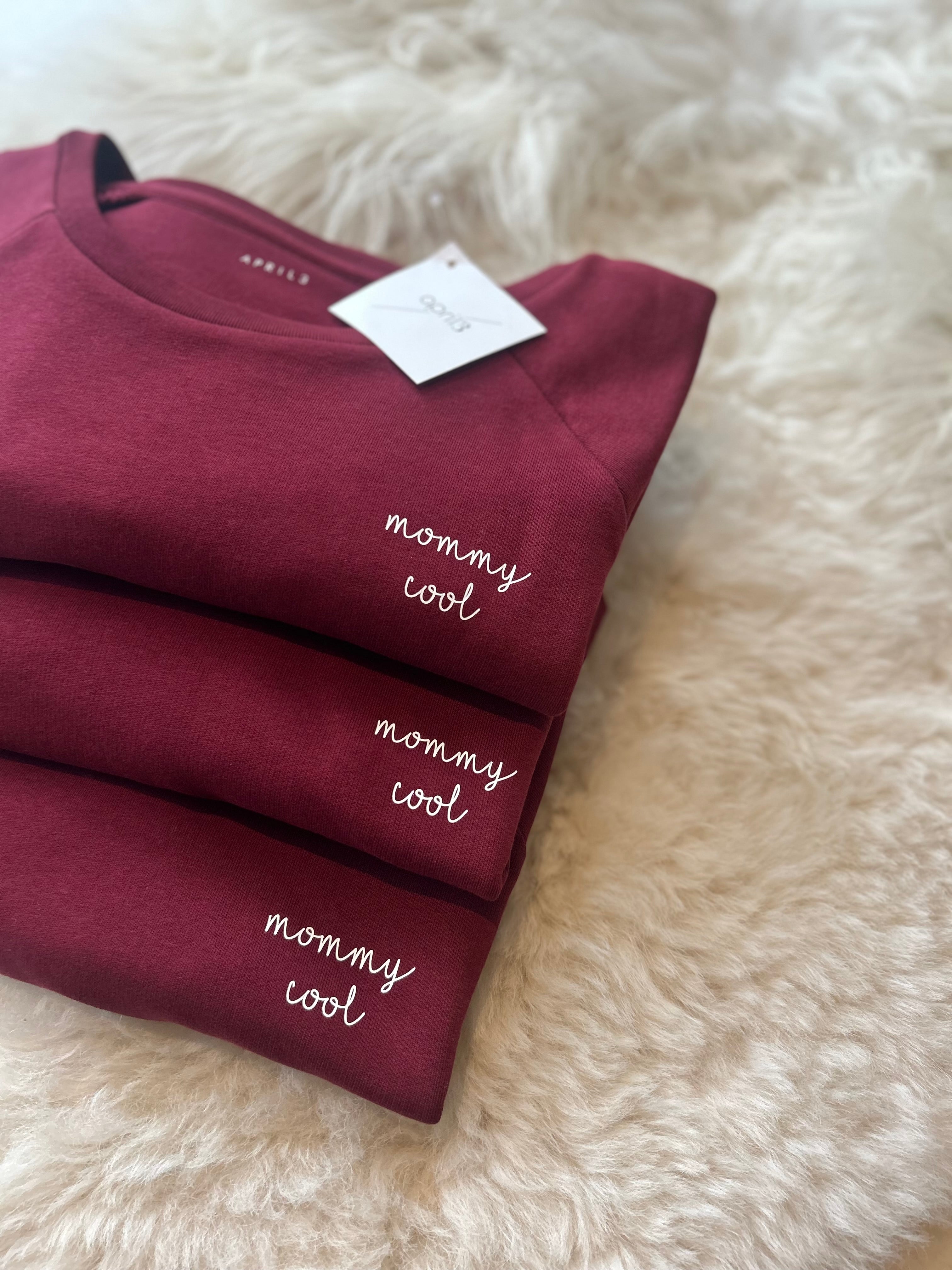 Burgundy sweater | white print | relaxed fit with wide neck | ‘mommy cool’ | for women.